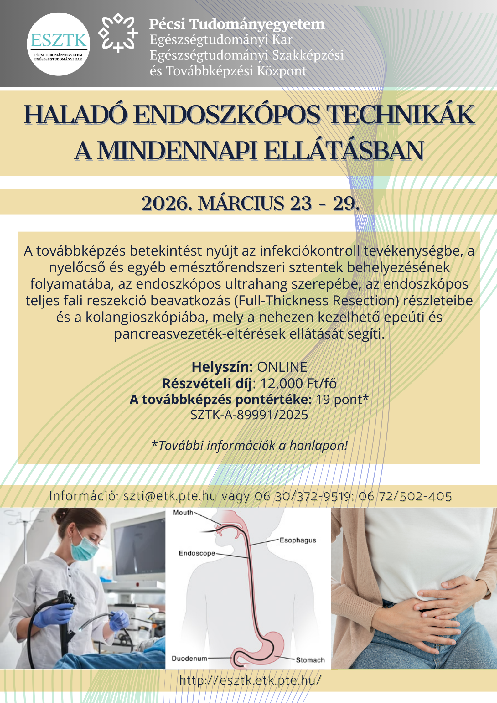 A továbbképzés betekintést nyújt az infekciókontroll tevékenységbe, a nyelőcső és egyéb emésztőrendszeri sztentek behelyezésének folyamatába, az endoszkópos ultrahang szerepébe, az endoszkópos teljes fali reszekció beavatkozás (Full-Thickness Resection) részleteibe és a kolangioszkópiába, mely a nehezen kezelhető epeúti és pancreasvezeték-eltérések ellátását segíti.