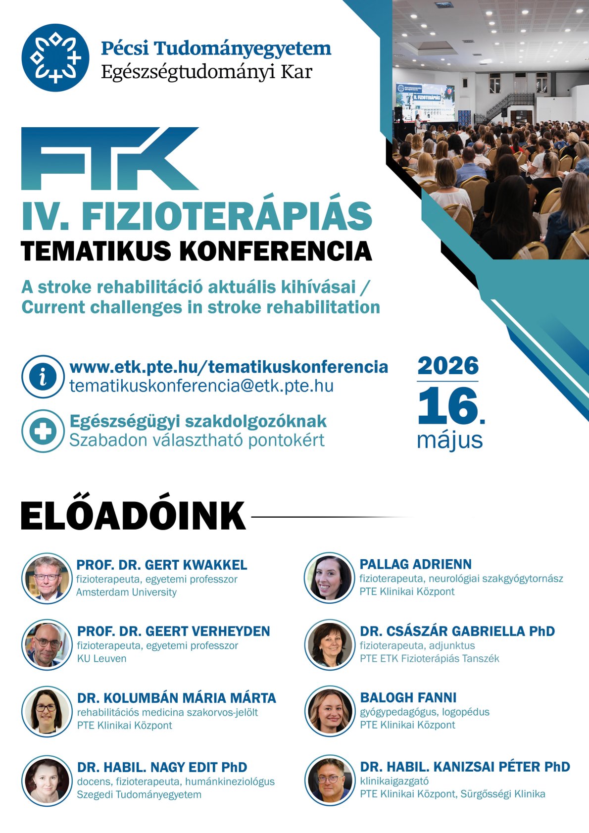 Nagy szeretettel várunk minden kedves érdeklődőt a stroke rehabilitáció témakörben rendezett konferenciánkon. Immár a negyedik tematikus konferenciával jelentkezünk 2026-ban Pécsett. Idei rendezvényünkkel igyekszünk mély betekintést nyújtani a stroke betegek komplex rehabilitációjába és kivételes konferencia élményt nyújtani neves külföldi és hazai előadók segítségével. Büszkék vagyunk arra, hogy nemzetközileg elismert szaktekintélyek is elfogadták felkérésünket, ezzel is igyekszünk emelni fizioterápiás eseményünk színvonalát.