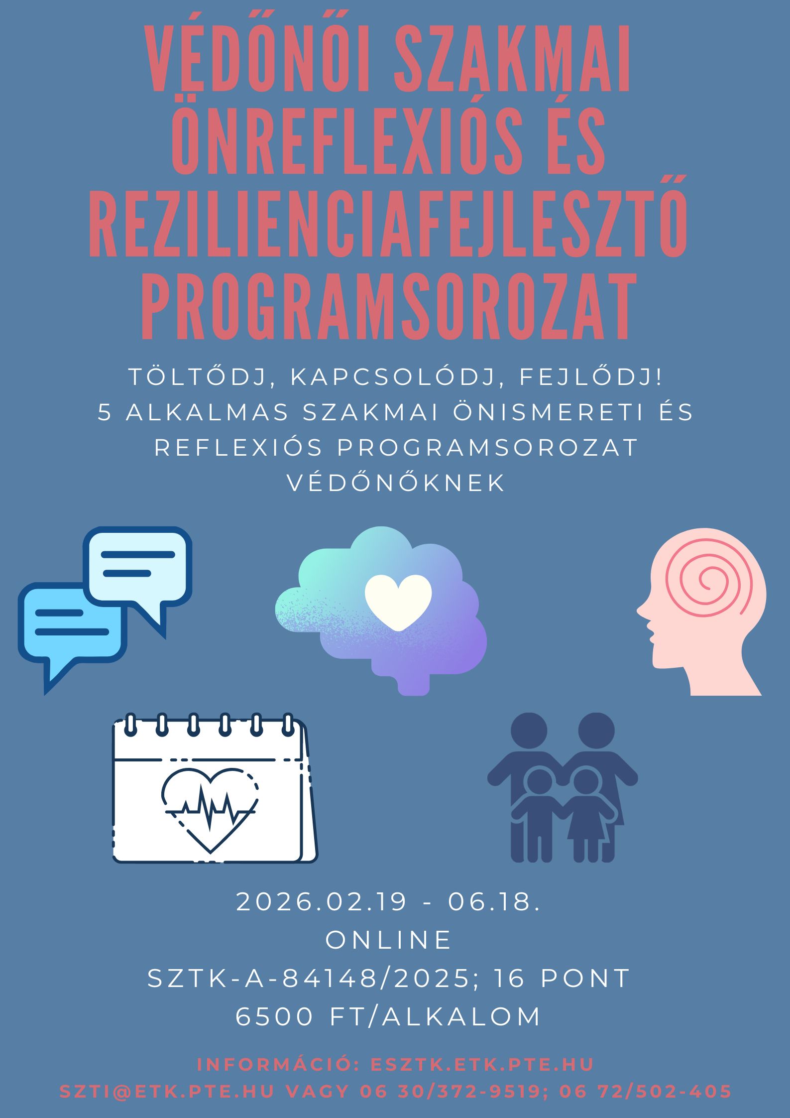 A programsorozat célja a védőnők szakmai működésének támogatása a mindennapi feladatokhoz kapcsolódó kommunikációs, etikai és érzelmi kihívások tudatosításán keresztül. Az öt alkalomból álló tematikus sorozat lehetőséget biztosít a résztvevők számára önreflexiós készségeik fejlesztésére, szakmai határaik megerősítésére, valamint személyes erőforrásaik feltárására.